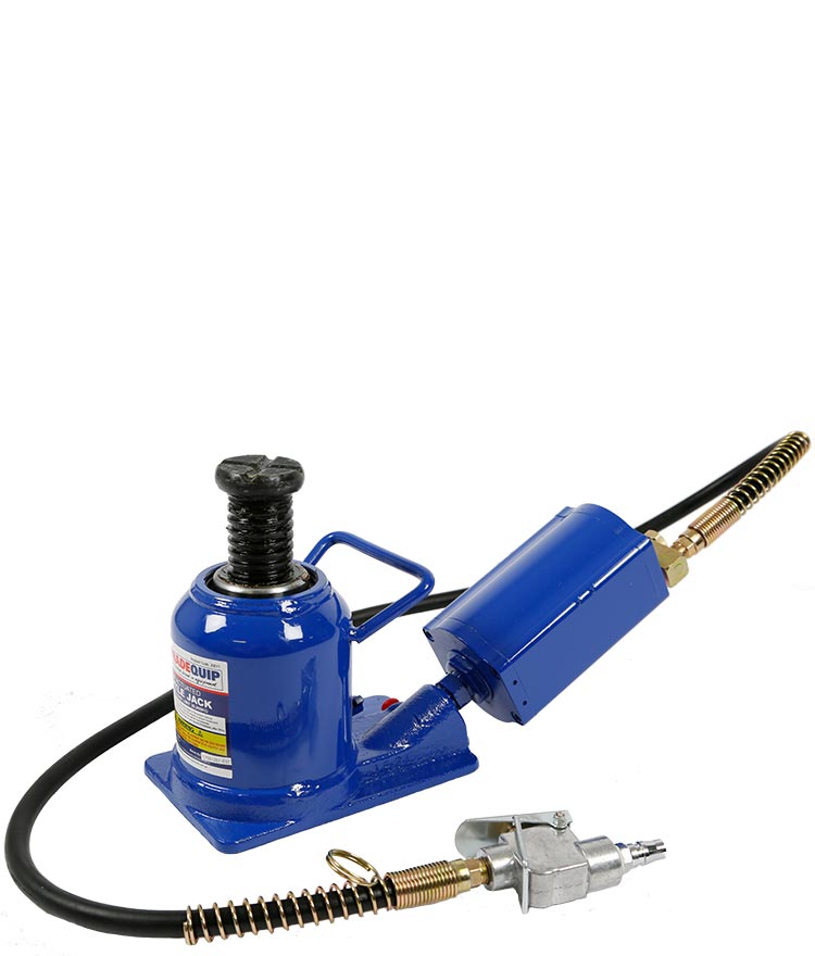 This TradeQuip "Made for the Trade" Air/ Hydraulic "Low Profile" Bottle Jack is designed to operate pneumatically. This unit provides enough lifting power for use with farm vehicles, heavy duty machinery, industrial construction equipment and more.  It’s low profile design get’s you out of tight situations with ease. This 20,000kg heavy-duty air/hydraulic bottle jack with powerful heavy duty operation is the perfect choice for a wide variety of uses. The power of air makes it easy to lift farm vehicles, trucks, lawn mowers, heavy equipment and other large loads! Use this workhorse with a 100-145 PSI rated air pressure supply to lighten the load and provide the fast, strong lifting power you need. The 150–260mm lift range raises the load to the desired height and a knurled, heat-treated pad with screw height adjustment allows you to fine-tune the jack from there. This Bottle Jack is designed for day in and day out durability. A rugged high-grade steel frame is teamed with a lead-free paint finish that covers the entire surface to ensure long-lasting wear and help prevent rust. The paint is oil-, grease- and dirt-resistant for easy cleanup no matter how often you put this jack to work.