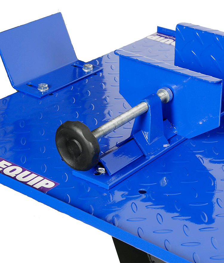 Our TradeQuip Hydraulic Motorcycle Lifter is the perfect solution for professional workshops or home mechanics that want to take their maintenance and servicing to the next level. This unit is bigger, stronger, heavier and lifts higher than similar looking bike lifts sold in Australia. Bending down and getting on your hands and knees whilst servicing will be a thing of the past when you can easily lift your bike to an optimal working level. Stability and security will not be an issue, the 45 degree front wheel clamp along with the 4 tie-down points will allow you to prevent any unwanted movement of the bike. Underneath the platform is a professional quality steel frame, an adjustable locking device to prevent accidental lowering and a high quality 500kg rated capacity hydraulic ram. – rated to 450kg at 750mm lift height (weight capacity reduces over this height)