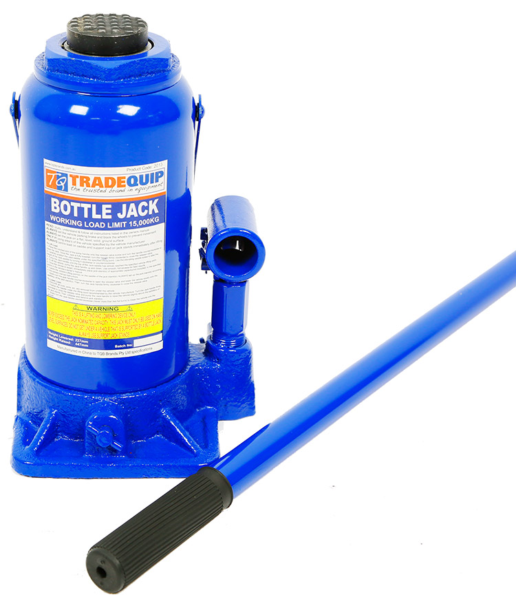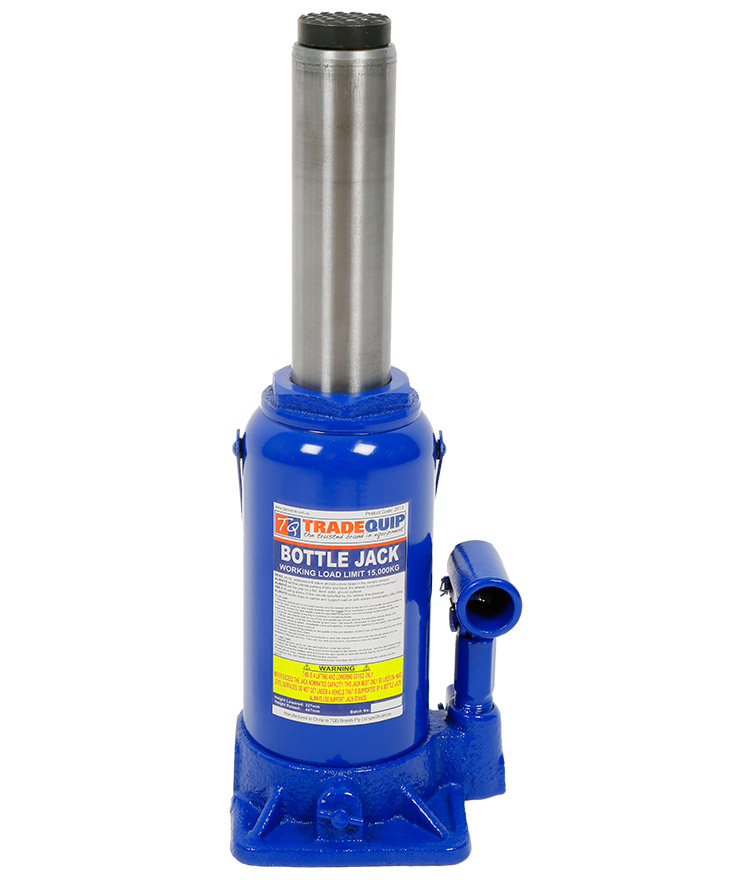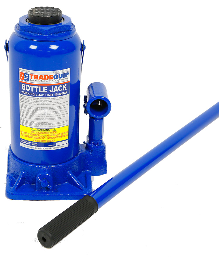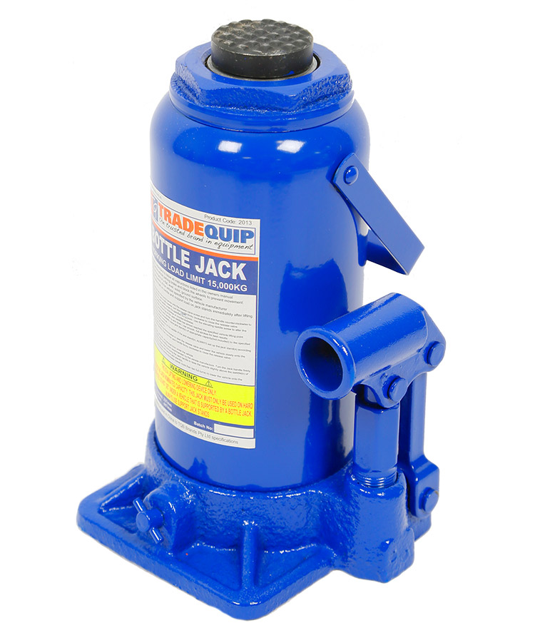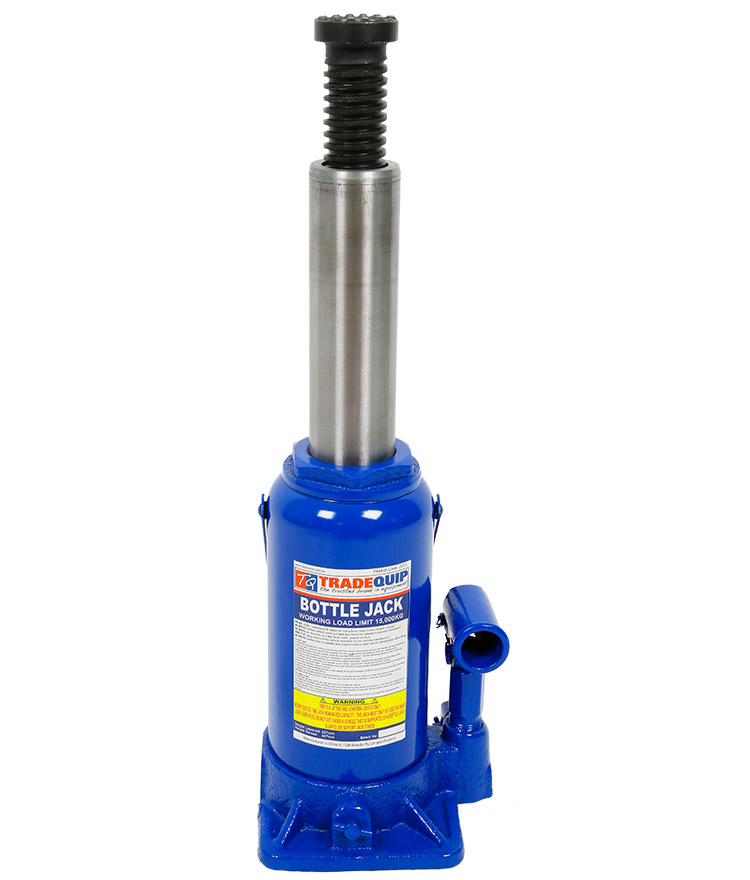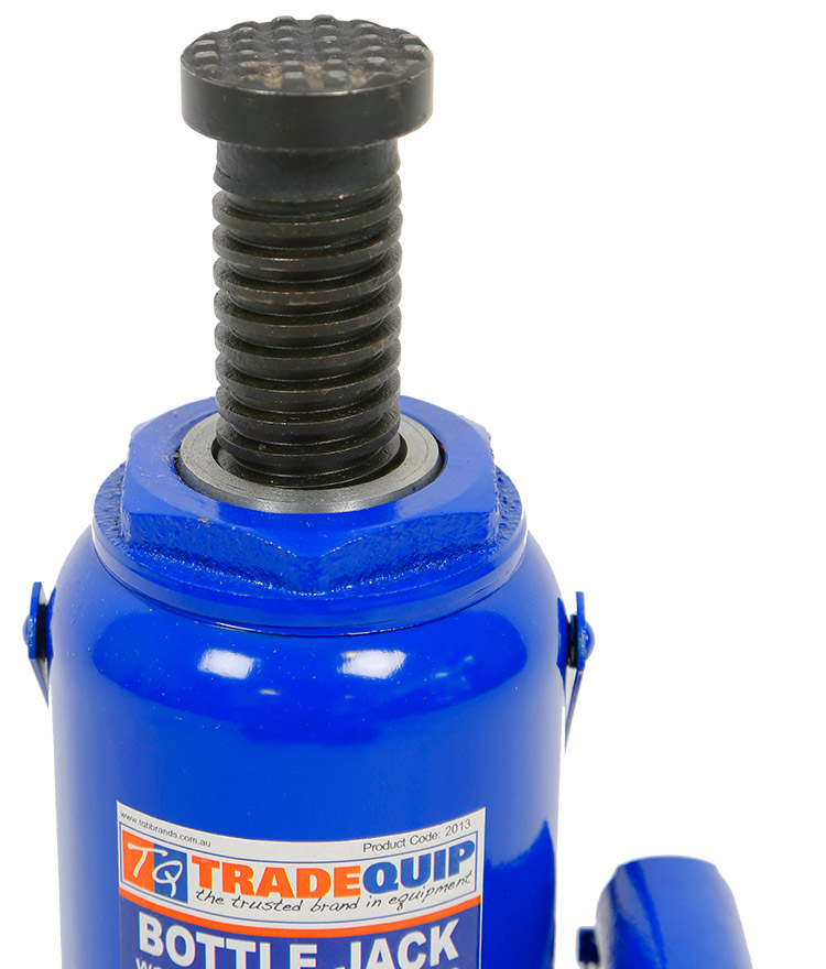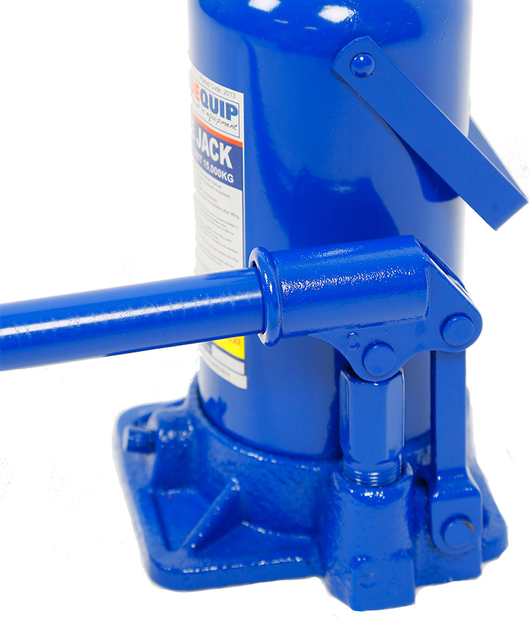 This powerful, heavy-duty TradeQuip Hydraulic Bottle Jack with high quality glide-action pressure pump is designed for hard-hitting commercial use, making large loads easy to lift. The lightweight jack is ideal for lifting farm vehicles, heavy-duty machinery, industrial construction equipment and more. High quality, fitted with unique overload protection system and large stable base. Supplied with 500mm pump handle.