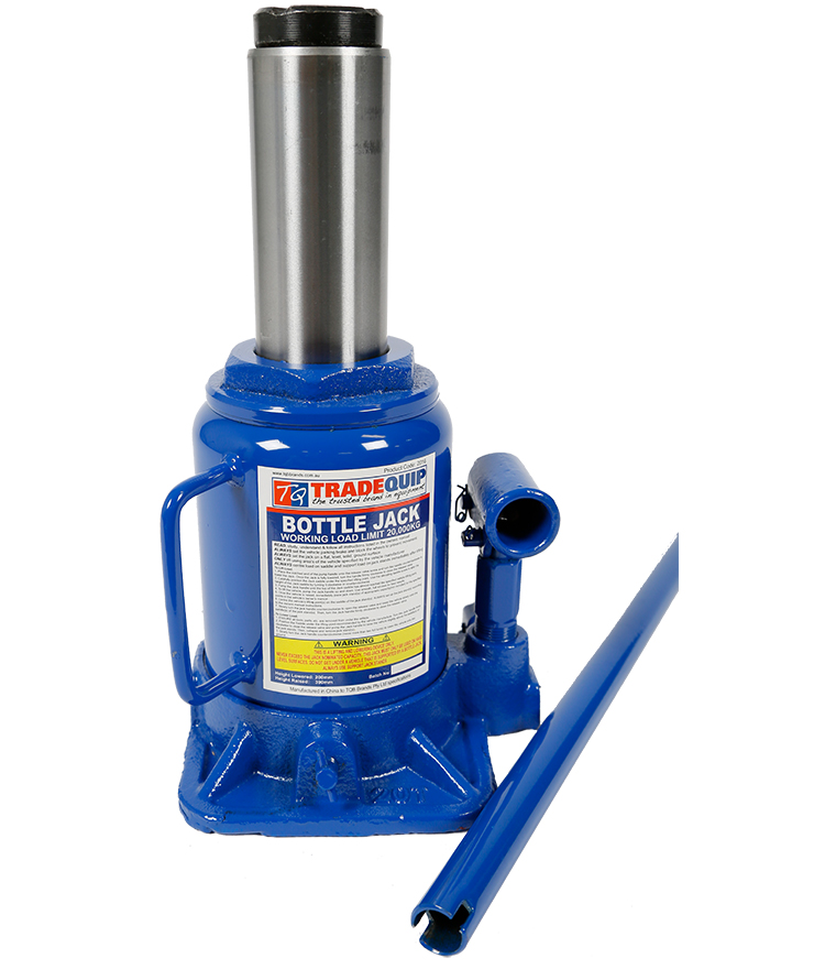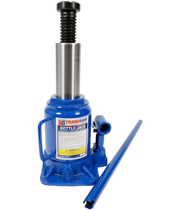 This powerful, heavy-duty TradeQuip "Made for the Trade" Hydraulic Bottle Jack with high quality glide-action pressure pump is designed for hard-hitting commercial use, making large loads easy to lift. The lightweight jack is ideal for lifting farm vehicles, heavy-duty machinery, industrial construction equipment and more. Professional quality, ideal for the workshop or panel shop. Fitted with unique overload protection system and large stable base. Supplied with 500mm pump handle. The low profile design of this hydraulic jack fits underneath tight spots. The jack drops down to just 200mm at its lowest point, making it ideal for use in automotive and ag repair shops, and other small spaces.