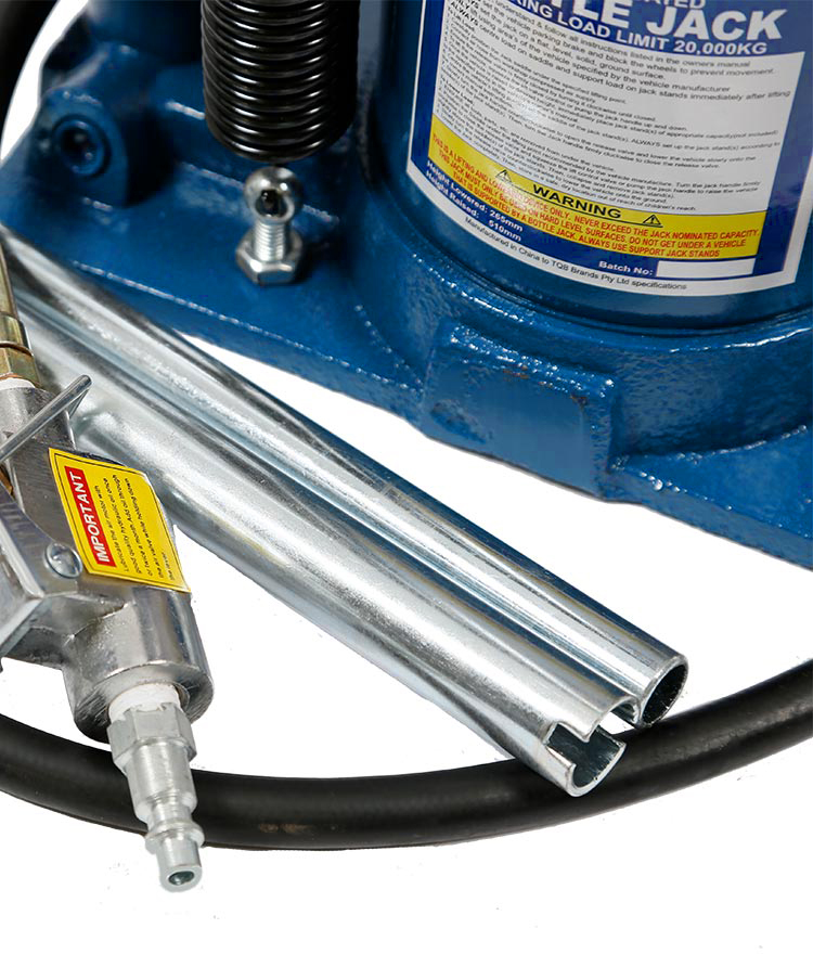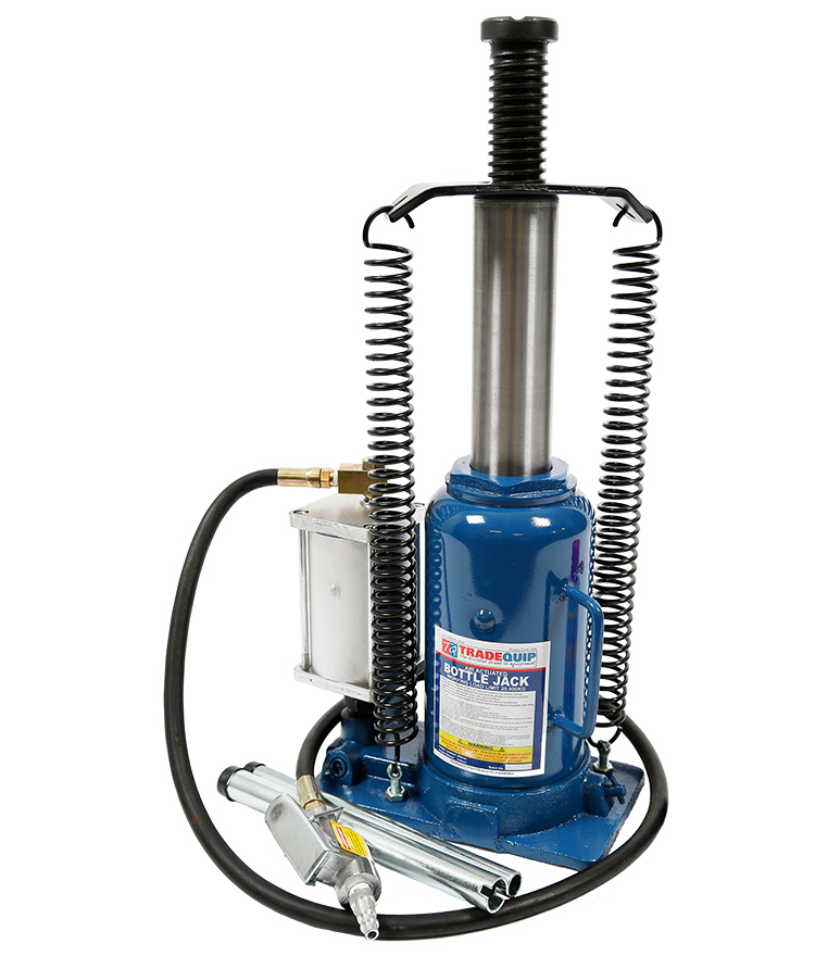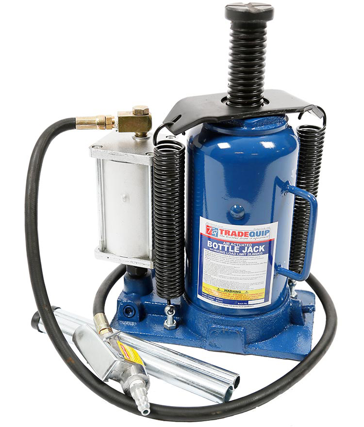 Our TradeQuip "Made for the Trade" Air/Manual 20,000kg Bottle Jack is designed to operate either manually or pneumatically. The manual function allows for normal operation anywhere, even without an air supply. Ideal for onsite/offsite lifting of farm vehicles, heavy duty machinery, industrial construction equipment and more. The Air/Manual Bottle Jack is equipped with an hydraulic system and a mounted powerful manual pump. Used on light or heavy vehicles, they are compact, versatile and safe to use. Our TradeQuip "Made for the Trade" design includes a quality safety valve to prevent overloading and a larger base to provide high safety and greater stability. This Air/Manual Bottle Jack is fitted with a Professional Quality Air Turbo Motor designed to meet the demands of adverse climate conditions and extreme temperatures. This 'Best Selling' Jack is a favourite of the Qld and WA mine maintenance crews, due to it's strong lifting power and long lasting wear characteristics.