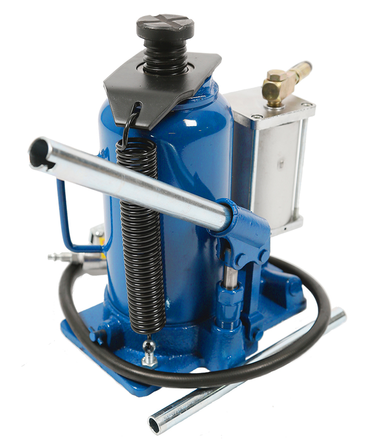 This 20,000kg heavy-duty air/hydraulic bottle jack is the perfect choice for a wide variety of uses. The power of air makes it easy to lift farm vehicles, trucks, trailers, heavy equipment and other large loads! Use this workhorse with a 90-120 PSI rated air pressure supply to lighten the load and provide the fast, strong lifting power you need, or operate it manually for normal operation just about anywhere. The 265–430mm lift range raises the load to the desired height and a knurled, heat-treated pad with 100mm screw height adjustment allows you to fine-tune the jack from there.