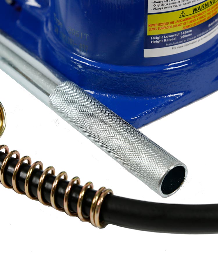 Fitted with a safety overload valve for extra protection, the safety valve is installed between the pump and high-pressure check valve in the barrel/lift ram assembly. When attempting to raise a load greater than the jack's capacity, the safety valve opens on each pump stroke and diverts any further oil back to the reservoir thus preventing the raising of the load.