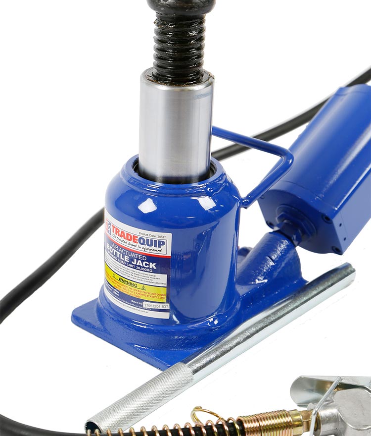 This TradeQuip "Made for the Trade" Air/ Hydraulic "Low Profile" Bottle Jack is designed to operate pneumatically. This unit provides enough lifting power for use with farm vehicles, heavy duty machinery, industrial construction equipment and more.  It’s low profile design get’s you out of tight situations with ease. This 20,000kg heavy-duty air/hydraulic bottle jack with powerful heavy duty operation is the perfect choice for a wide variety of uses. The power of air makes it easy to lift farm vehicles, trucks, lawn mowers, heavy equipment and other large loads! Use this workhorse with a 100-145 PSI rated air pressure supply to lighten the load and provide the fast, strong lifting power you need. The 150–260mm lift range raises the load to the desired height and a knurled, heat-treated pad with screw height adjustment allows you to fine-tune the jack from there. This Bottle Jack is designed for day in and day out durability. A rugged high-grade steel frame is teamed with a lead-free paint finish that covers the entire surface to ensure long-lasting wear and help prevent rust. The paint is oil-, grease- and dirt-resistant for easy cleanup no matter how often you put this jack to work.