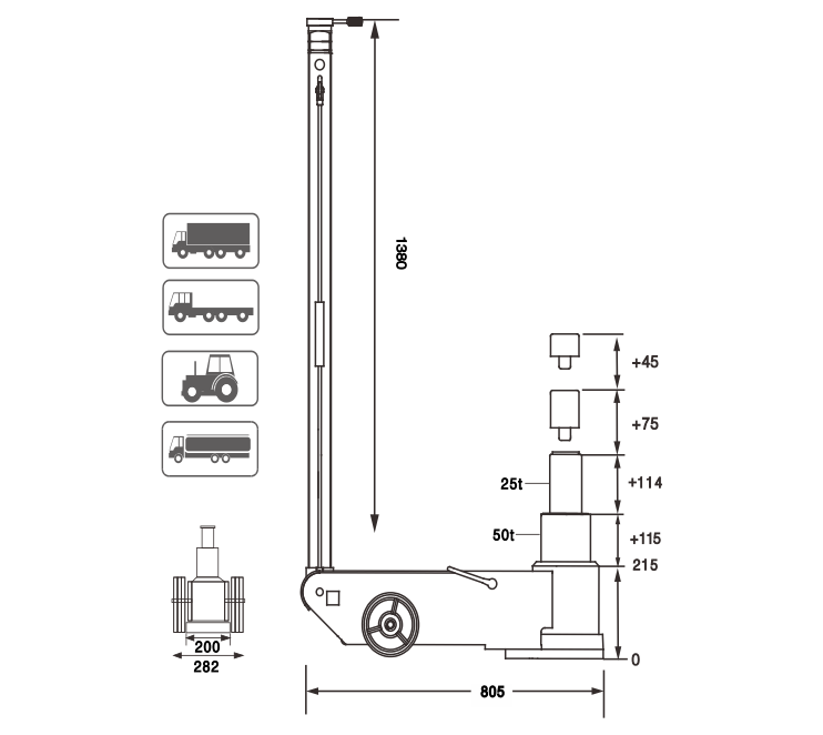 The BTJ2550TA quickly and easily manages a hefty 50,000kg in the first stage lift position and 25,000kg at the higher 2nd stage extension. This Air Actuated Commercial Jack is designed for heavy duty commercial use and features a long reach “T" handle and large rubber wheels for smooth manoeuvring around the workshop. As always with BORUM, safety is just as important as industrial standard quality, so all BORUM Truck Jacks have a built-in safety valve to prevent overloading and keep the operator safe. Additional safety feature includes a Self-Return lowering and lifting switch to ensure complete control during operation. With a minimum height of 215mm this jack is ideal for medium ground-clearance vehicles and a high lift maximum of 564mm (includes additional lifting saddles), this BORUM Air Actuated Jack is a very versatile heavy-lifter suitable for most workshops. (Previous models include product code/s; BAJ2080)
