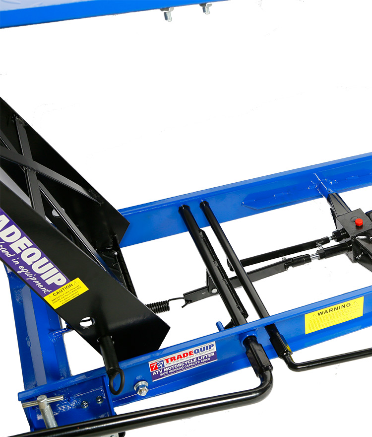 This TradeQuip "Made for the Trade" Hydraulic Motorcycle Lifter has a safe working capacity of up to 450 kg. The hydraulic foot pump raises and lowers ATV/Bike while the automatic safety lock makes sure you are safe and secure the entire time. This professional quality 11 gauge steel plate construction makes this hydraulic lifter one of the strongest on the Australian market. The hydraulics system operates via a dual pedal mechanism. One pedal raises the Lifter while the other lowers it. This Lifter is also designed with safety in mind, the features include a wheel vice chock, stop plate, and tie-down strap access ports. It’s diamond plating surface minimises tyres slipping and sliding as you work on your bike. The built-in swivel castors provide convenient mobility and stability when you need it and the lockable bolts ensure its secure when you don't. The TradeQuip Hydraulic Motorcycle Lifter is complete with an extra-large removable loading ramp which is also suitable for motorcycles with kickstands. The lifters robust and versatile construction, includes in a front wheel vice and 4 hook mounts for securing the load.