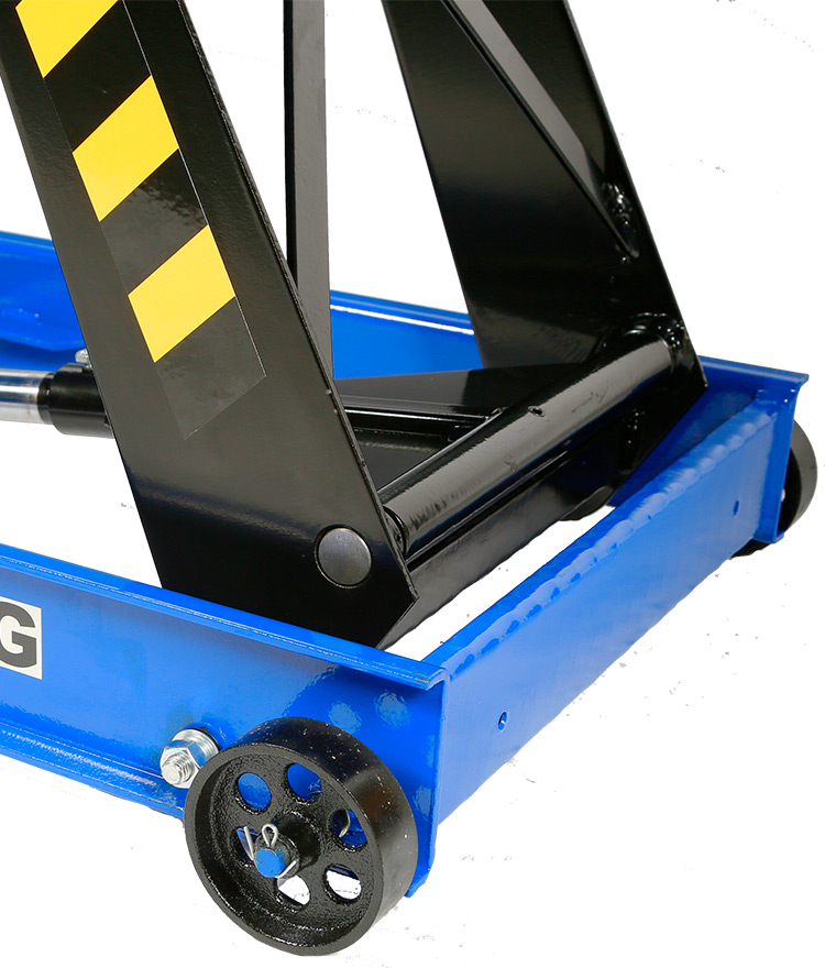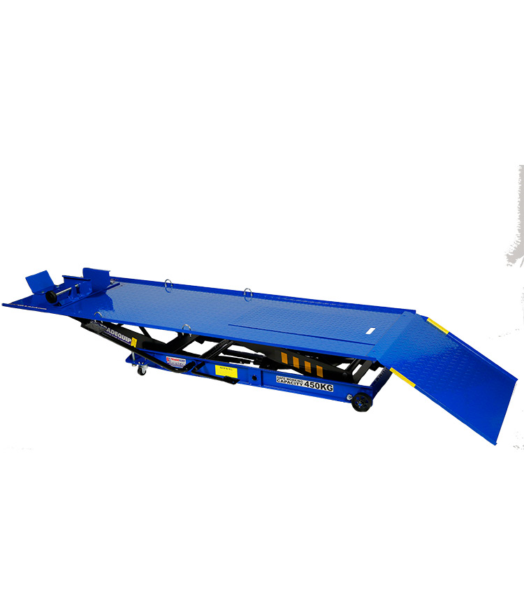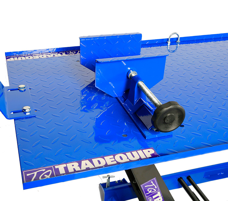 Our TradeQuip Hydraulic Motorcycle Lifter is the perfect solution for professional workshops or home mechanics that want to take their maintenance and servicing to the next level. This unit is bigger, stronger, heavier and lifts higher than similar looking bike lifts sold in Australia. Bending down and getting on your hands and knees whilst servicing will be a thing of the past when you can easily lift your bike to an optimal working level. Stability and security will not be an issue, the 45 degree front wheel clamp along with the 4 tie-down points will allow you to prevent any unwanted movement of the bike. Underneath the platform is a professional quality steel frame, an adjustable locking device to prevent accidental lowering and a high quality 500kg rated capacity hydraulic ram. – rated to 450kg at 750mm lift height (weight capacity reduces over this height)