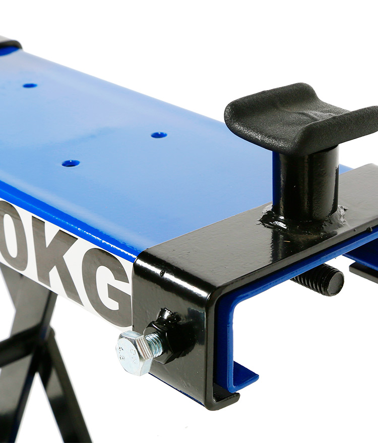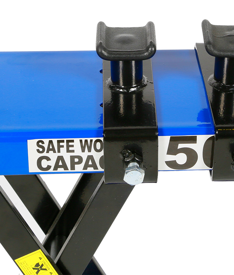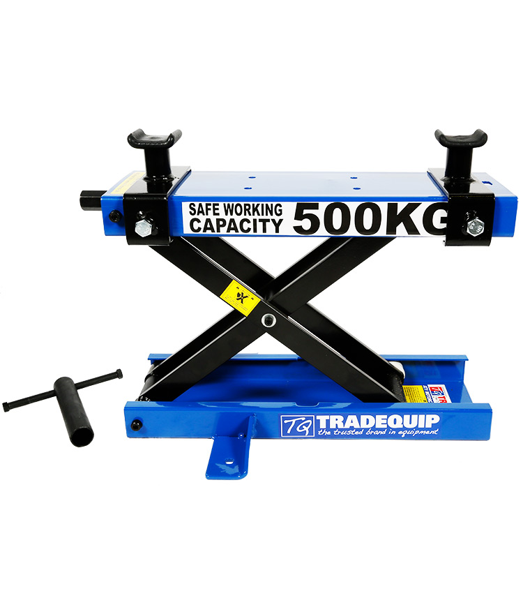 This TradeQuip "Made for the Trade" Motorcycle Lifter Support Stand has a safe working capacity of up to 500 kg. It is designed to elevate motorcycles, ATVs, riding mowers or snowmobiles to make repairs and maintenance easier and more comfortable. Our TradeQuip scissor style support stand is suitable for use either on a motorcycle lift or on the floor. The top of the platform has two sliding "U" shaped supports enabling the lifter to hold motorcycle subframe down tubes. Adjust the height of the scissor mechanism by rotating the screw adjuster manually.
