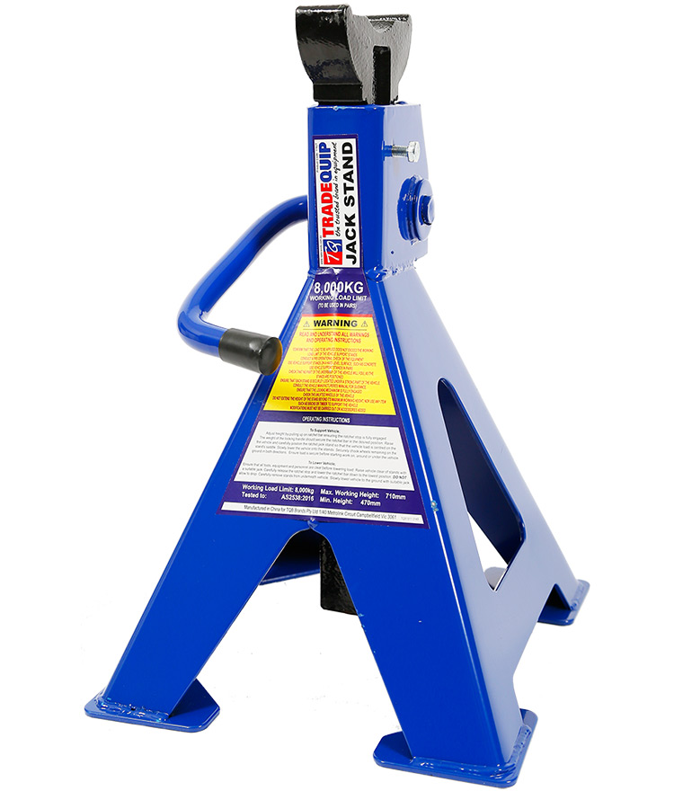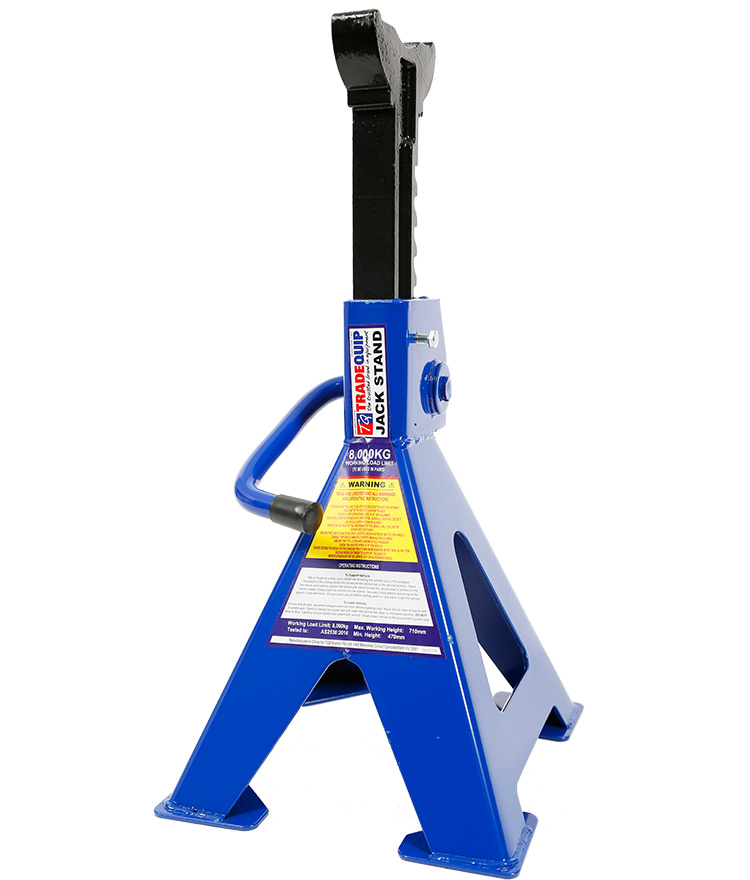 TradeQuip "Made for the Trade" Adjustable Jack Stands are ideally suited to the professional trade workshop. These ratchet type axle stands are designed with a cast iron support post, tough steel plate welded base and deep saddle for positive location under the vehicle. The cast iron post is equipped with angled teeth to prevent accidental release of load - the more weight applied, the tighter the post is locked.