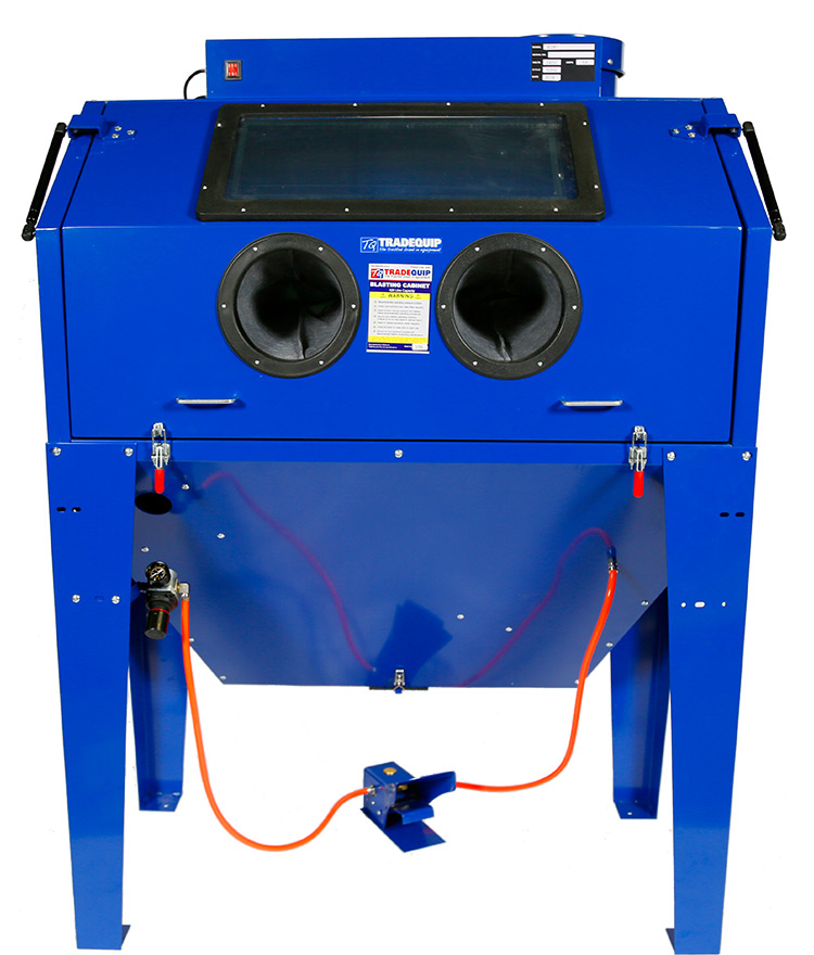 The TradeQuip "Made for the Trade" 3036T Blasting Cabinet features a large gas-lift assisted front door for easy loading and unloading. It has excellent lighting and a very powerful vacuum system. The lower hopper stores the abrasive material for use and reuse and opens easily to allow easy removal of any media. Always ready to use when you are, the cabinet can be constantly connected to your air supply and is ready for immediate use when you step on the pedal.