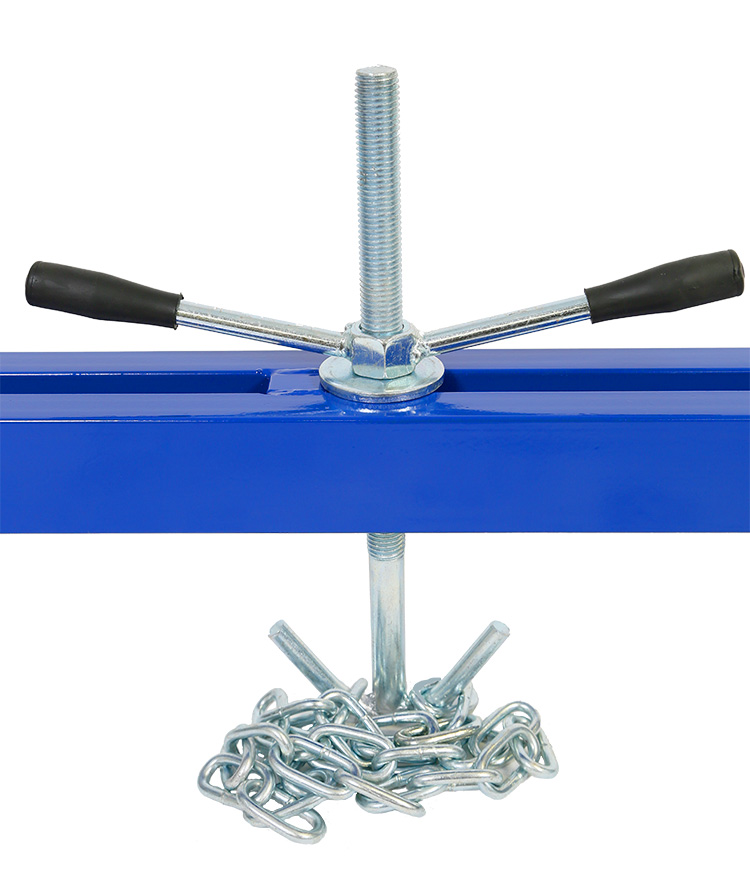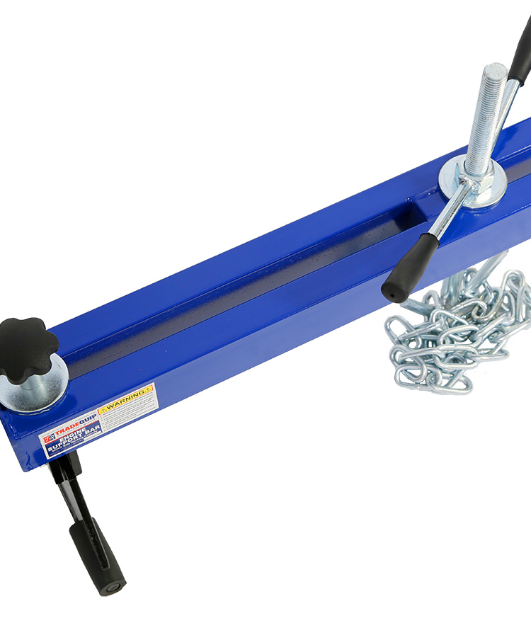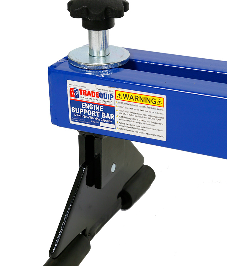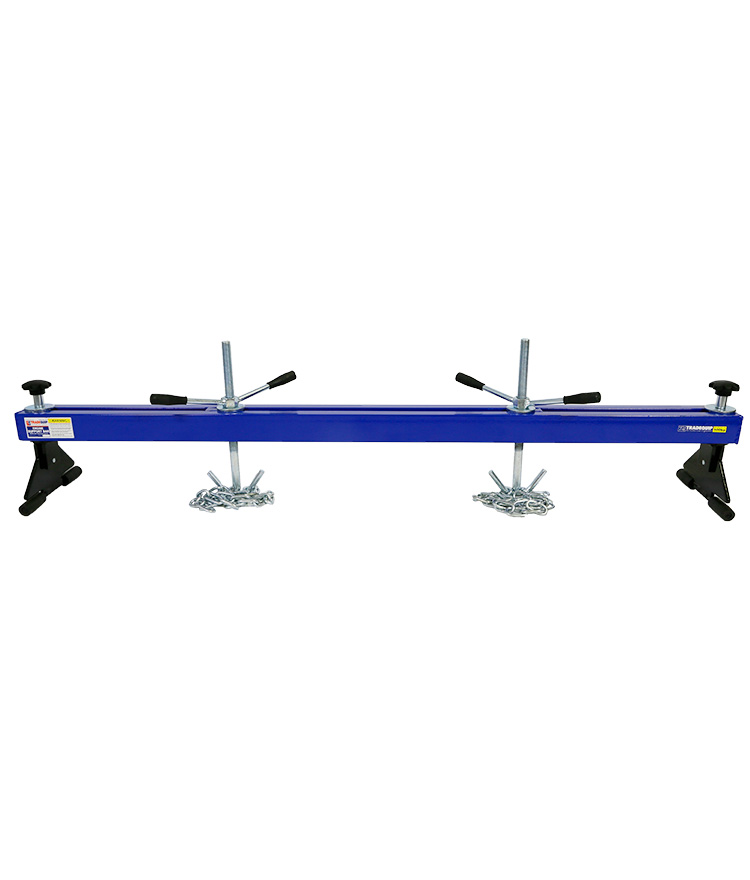 Constructed of high gloss enamel coated steel for durability, this TradeQuip 500kg capacity Engine Support Bar features dual hook assemblies for increased load balance when working on heavy engines or when removing the transmission or transaxle. This 1020T Engine Support Bar comes with adjustable extension arms, neoprene support pads and adjustable height screw. Designed to support and accurately position engines during maintenance operations such as replacing engine/transmission mountings and certain body panels, the rubber padded support legs prevents slippage as well as damage to paint.
