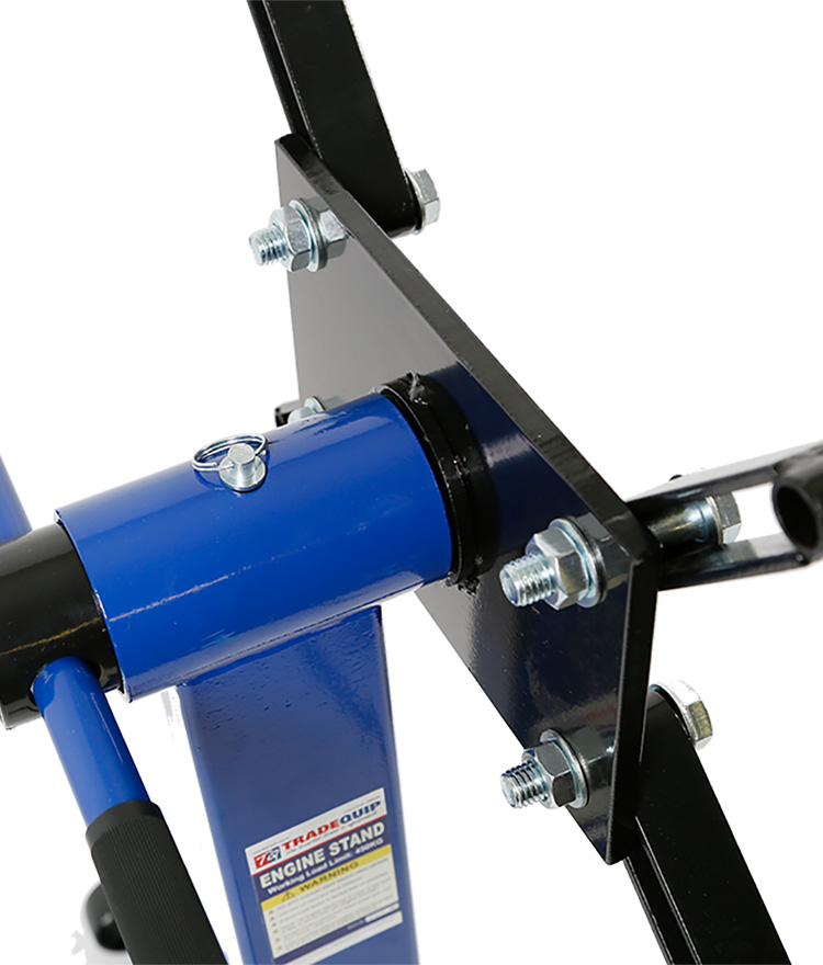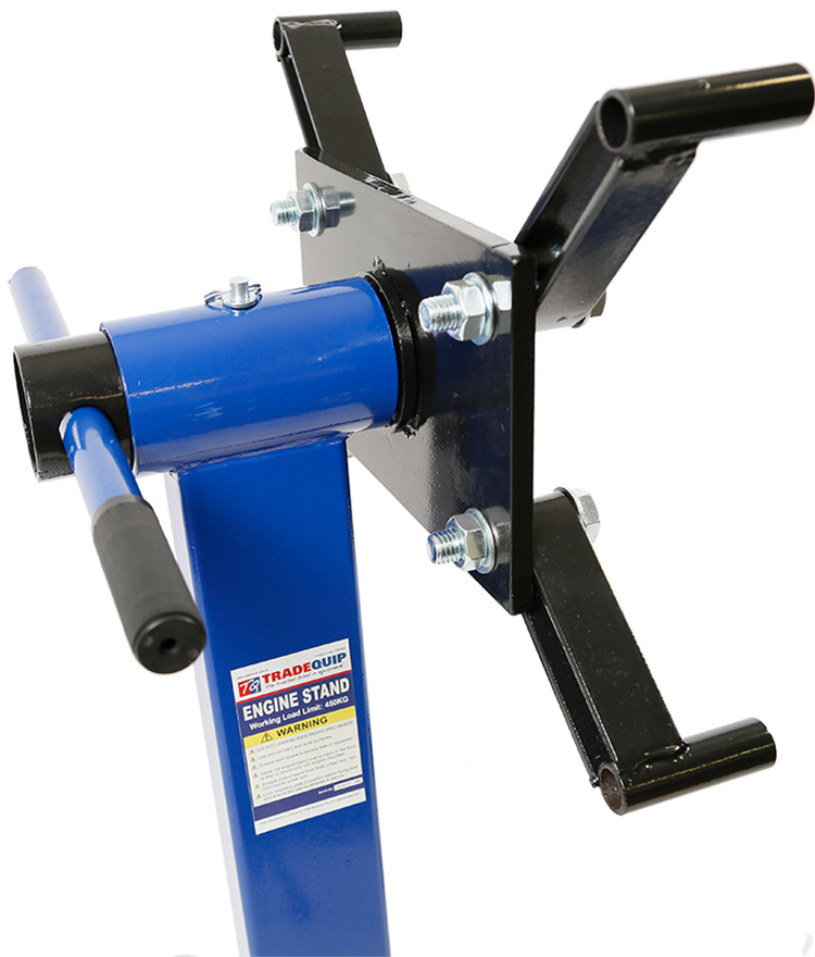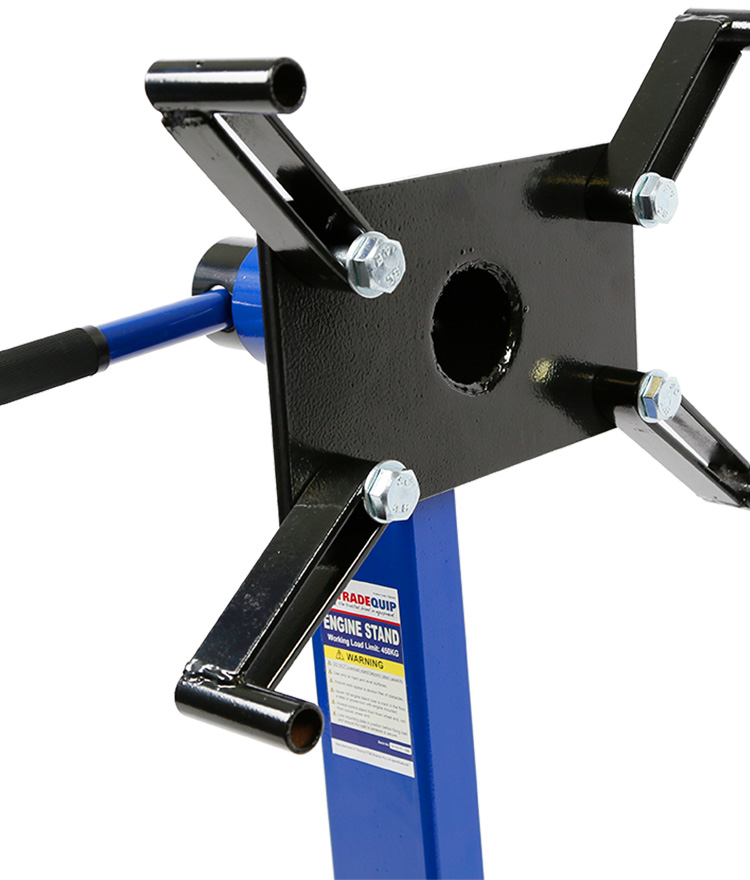 TradeQuip "Made for the Trade" 450kg Engine Stand has a 4-leg design featuring a rugged frame with a 4-hole mounting head that rotates 360°, making the unit ideal for 4 cylinder engines. When you've got an engine repair job that can’t be completed while the engine block is in the vehicle, this engine stand provides a sturdy support structure to secure the removed engine in mid-air, so you can access any part of it. Use an engine crane to remove the engine from the vehicle, then mount it to the faceplate on this engine stand. (Previous models include product code/s; 1006, RLES450)