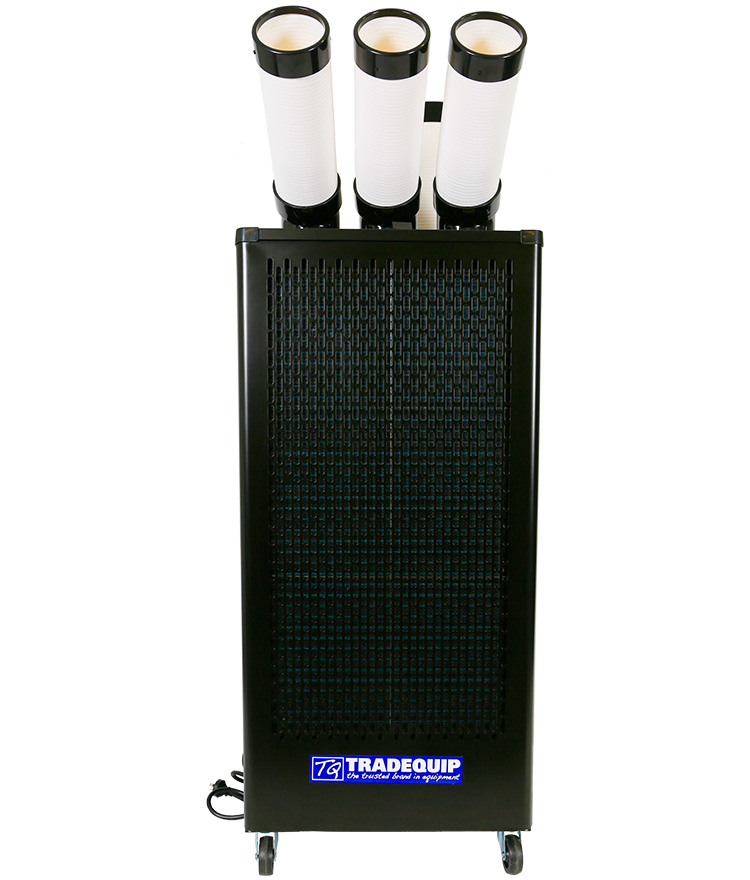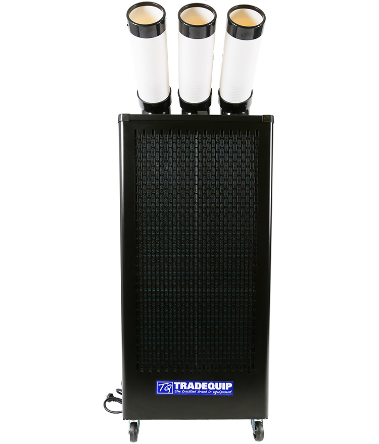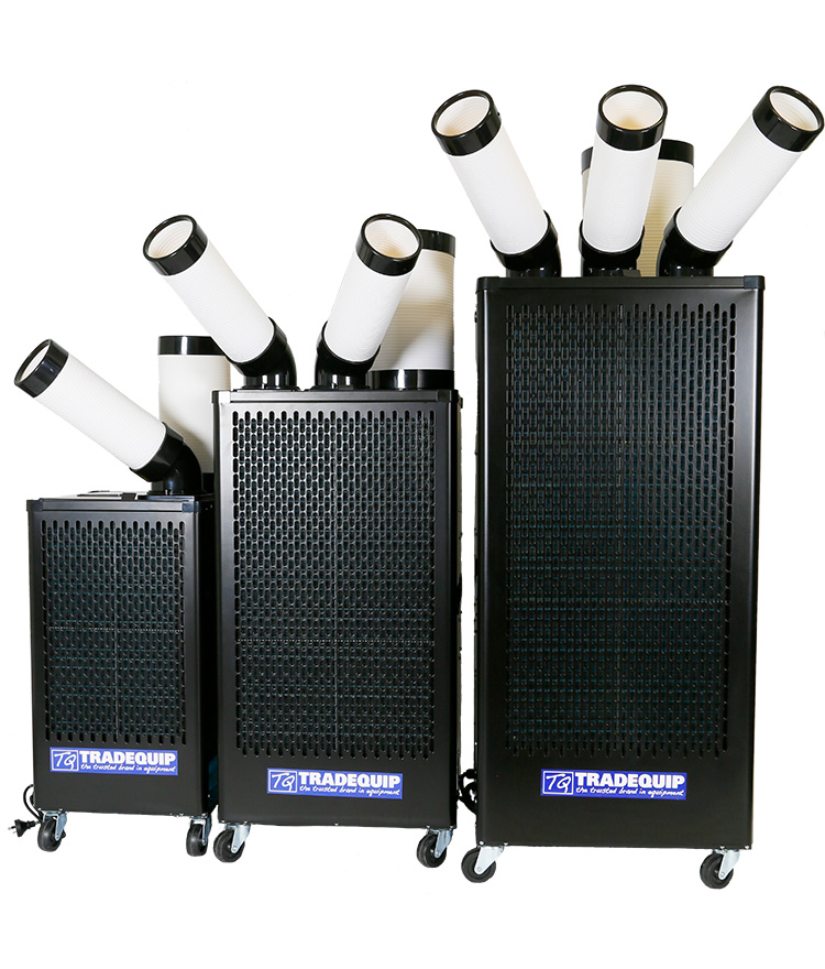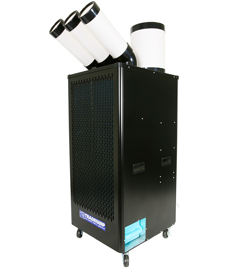TradeQuip “Made for the Trade” Portable Industrial Air Conditioners are designed for economical spot cooling in workshops, service rooms, warehouses and offices especially where other electrical equipment creates a heat load. These TradeQuip Portable Industrial Air Conditioners are completely self-contained and housed within an insulated cabinet. The unit’s exterior is constructed of galvanised steel and protected with a tough powder-coated, polyester finish. All models are equipped standard with heavy-duty castors for easy portability. TradeQuip Portable Industrial Air Conditioners bring in air from an outside source to cool its condenser, cycling hot air to an outside source. This provides a fresh cool air room temperature with high efficiency. Just wheel it in, plug it in and it goes to work immediately, giving high cooling capacity to wherever and at whatever point you require it.