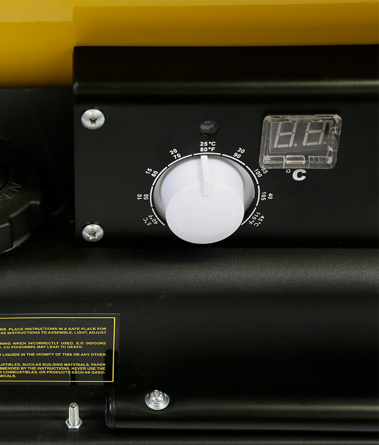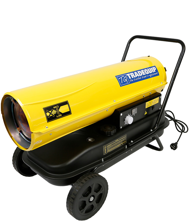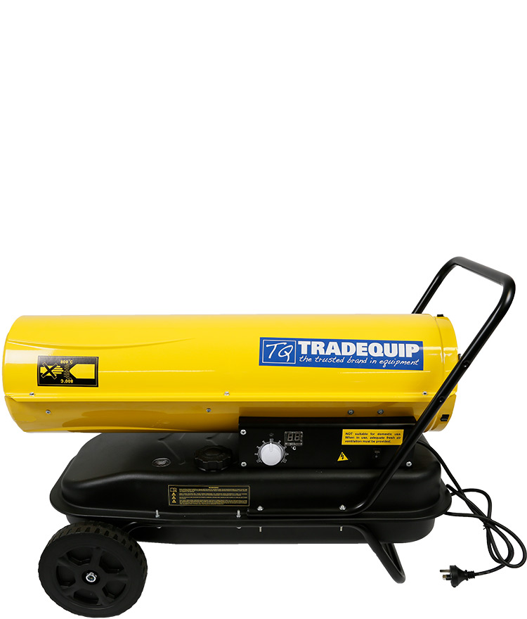 This TradeQuip "Made for the Trade" Direct-Fired Forced Air Workshop Heater is ideal for workshops, garages and warehouses, reducing concrete freeze and emergency heating. The 38 Litre fuel tank can run for 9 hours on a single fill. It has on-board diagnostics and additional safety features. Ideal for quickly and efficiently heating cold condition workshops, this forced air heater can be used in a variety of commercial and industrial settings and is fuelled by kerosene or diesel. It is a reliable heating solution for an area of approx. 300 square metres and is easy to move and position as required thanks to the ergonomically designed inbuilt handle.