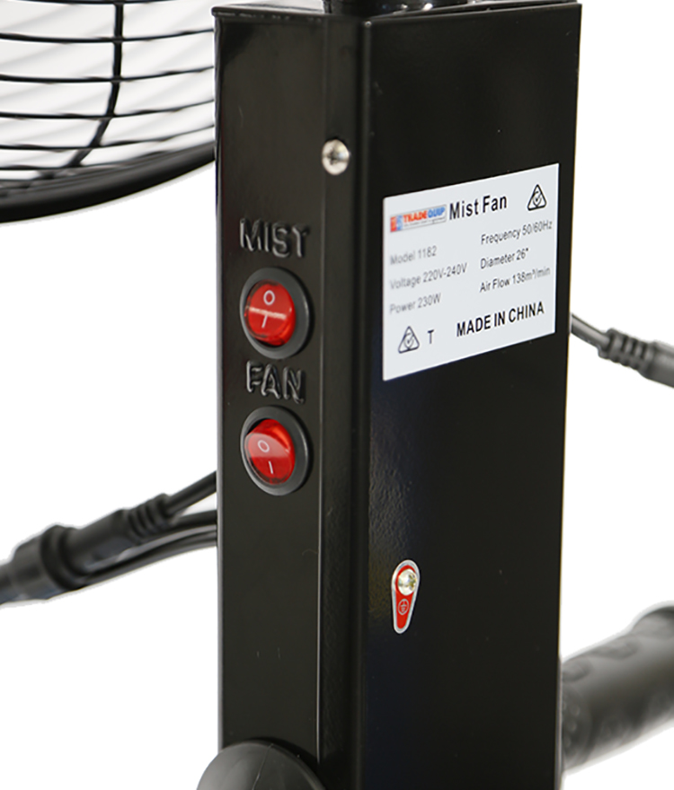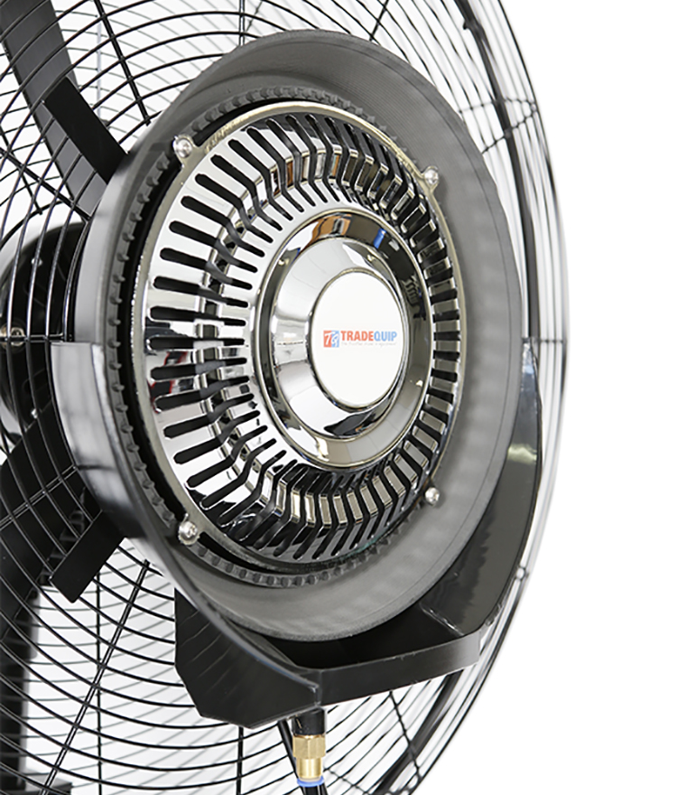 The TradeQuip "Made for the Trade" Misting Fan features an extra strong heavy duty grill and powerful 240V 230W 3 speed motor with an adjustable oscillating head. The fan evaporation absorbs the heat and decreases the temperature, improves the relative humidity and reduces the dust.