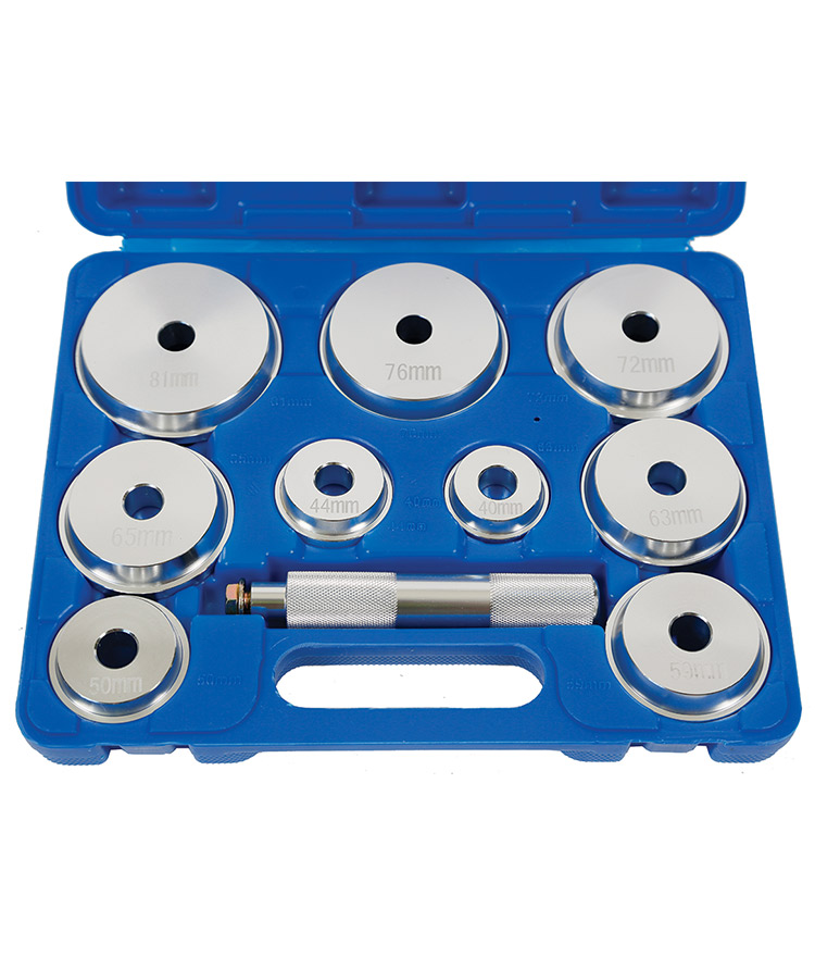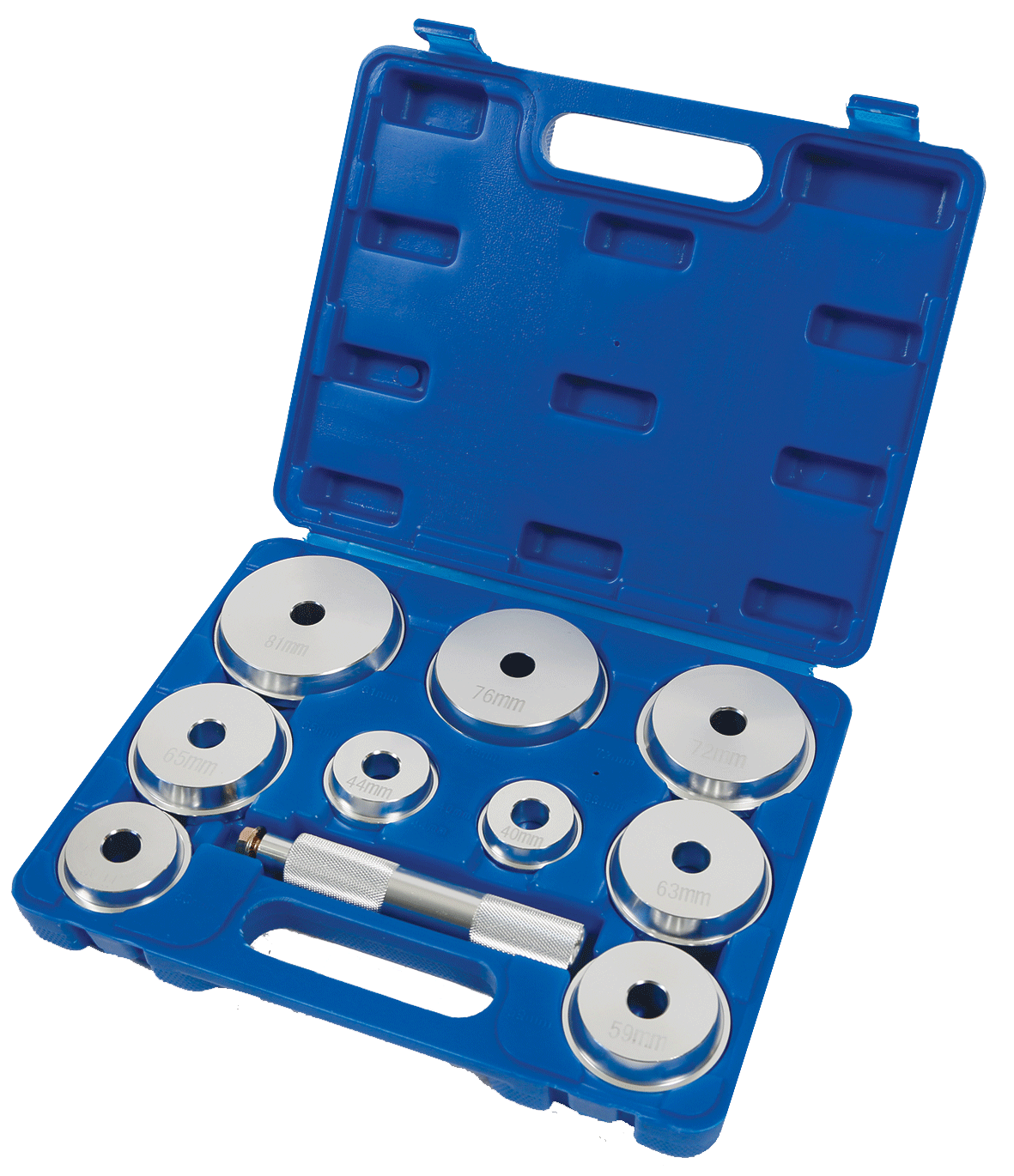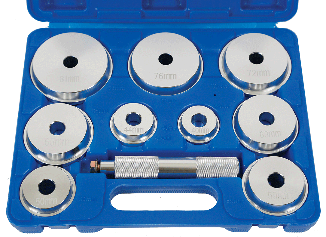 This versatile "TradeQuip "Bearing Race & Seal Driver set includes everything you need to quickly and easily installs wheel bearing races and seals without damage to the bearing race or axle housing.