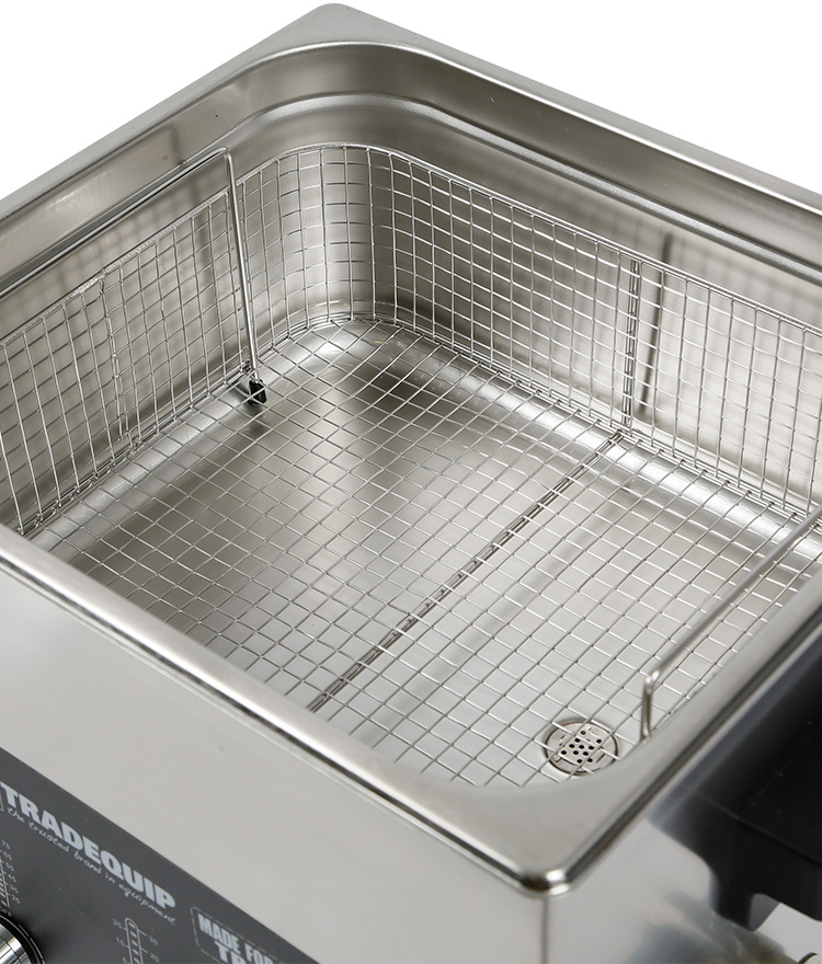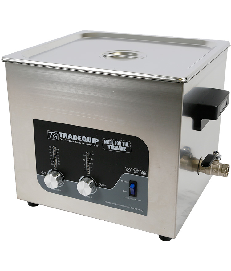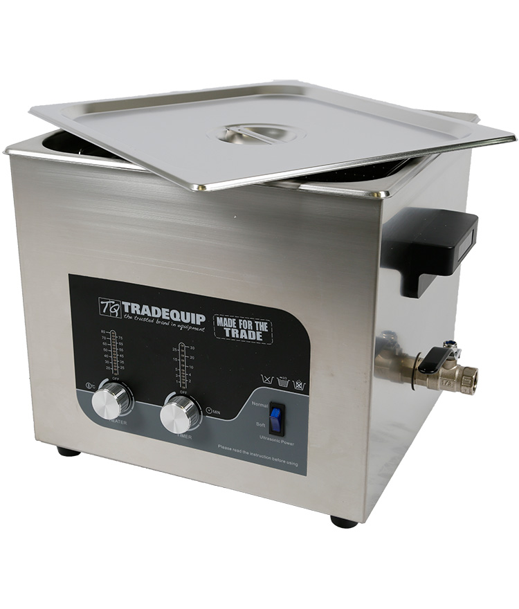 All TradeQuip "Made for the Trade" ultrasonic parts cleaners incorporate Lateral Oscillation Technology for fast and effective cleaning results. The internal basket system allows the lid to seal the working solution avoiding evaporation and reducing ultrasonic acoustic levels. The clear and easy design with compact and quiet operation make these products the market leaders. All TradeQuip tanks are manufactured from professional 304 grade 2mm stainless steel, with added thickness and increased corrosion resistance to alleviate problems associated with the use of citric acid. REGULAR CLEANING IS A MUST!  Failure to do so may void warranty. Electropolishing passivates stainless steel to a greater extent than any other process. It applies an invisible protection oxide fill on the surface which imparts a condition of maximum resistance to attack and corrosion. The tank is fitted with a convenient drain valve to empty and thoroughly clean any traces of cleaning solution and contaminants that are left over from cleaning cycle. This should be carried out at the end of each cleaning cycle and the tank be stored empty, clean and dry.