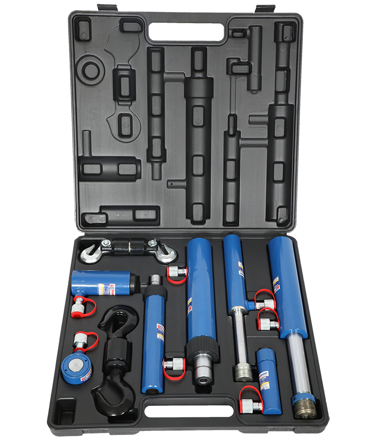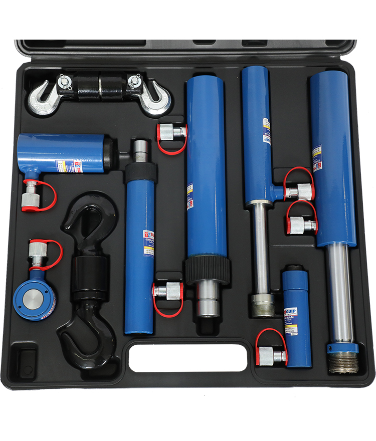 This TradeQuip "Made for the Trade" Hydraulic Ram Kit includes 2 puller rams and 5 pusher rams for lifting, pushing, pulling, bending, and straightening. A must for a variety of auto body, frame repair, and construction jobs. Ram and cylinder bearings are designed for protection against off-centre load stresses. High flow quick-connect coupler with dust cap. (Previous models include product code/s; RAMKIT)