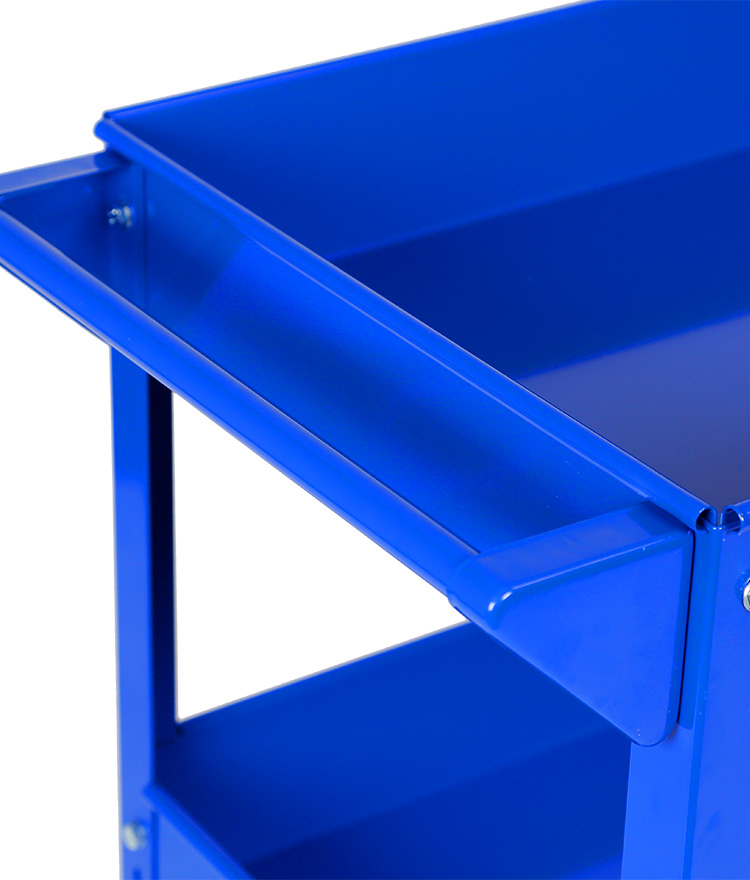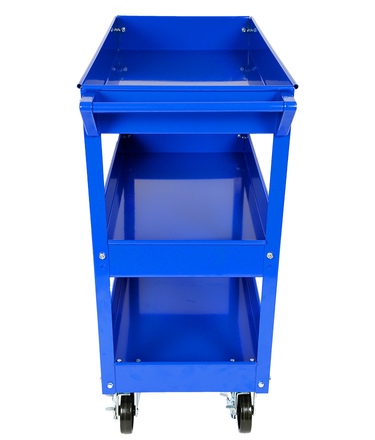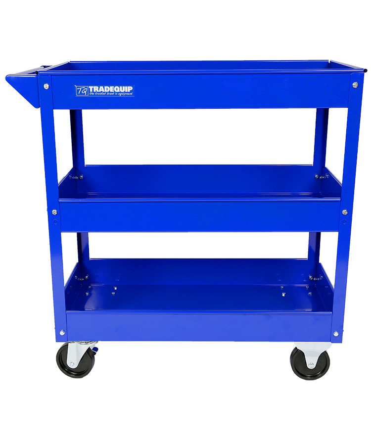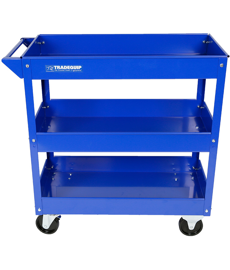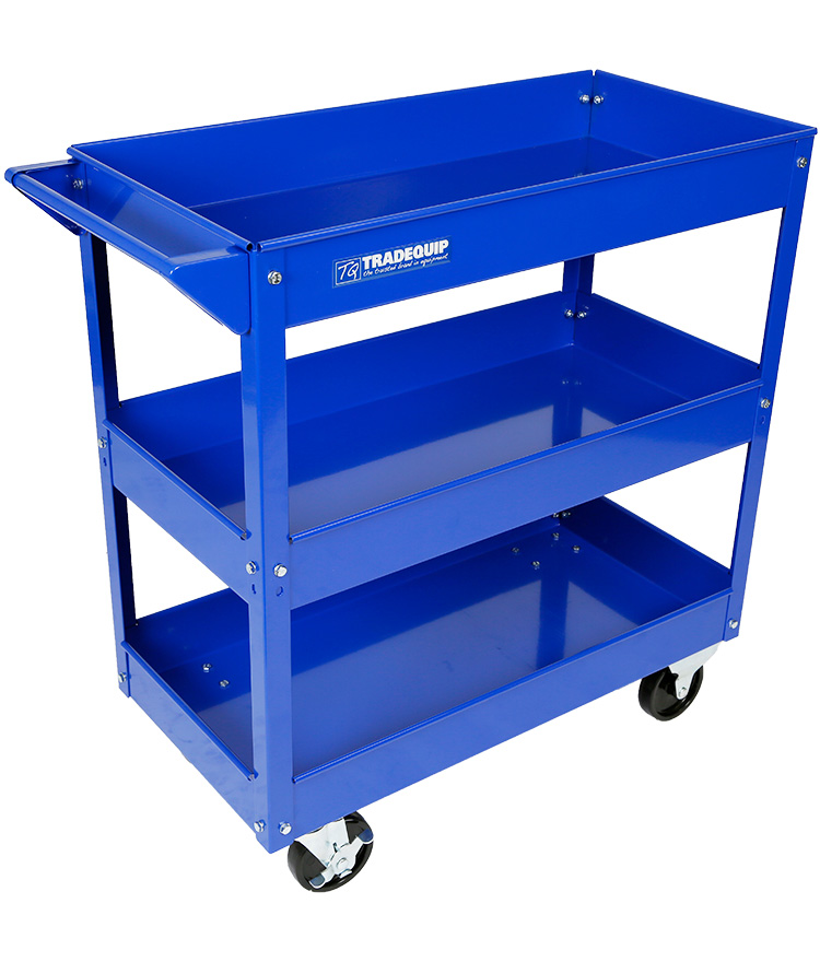Heavy Duty TradeQuip "Made for the Trade" steel construction makes this three shelf Workshop Tool Trolley durable enough for moving tools and car parts. Easily handles loads up to 150kg. Solid rubber castors let you manoeuvre the workshop trolley without marring the floor. Deep shelves give you plenty of storage for your tools and parts. This is the perfect heavy duty workshop trolley for garages, warehouses and workshops.