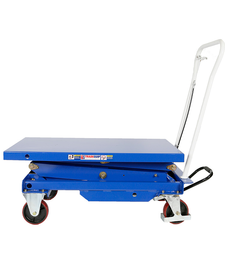 This TradeQuip "Made for the Trade" moveable, hydraulic scissor lift table can position and raise your work piece up to 1585mm by simply pumping on the foot pedal to the desired height. Features include a hand release lever to safely lower a heavy piece of work and two locking swivel casters to ensure stability once the scissor lift table is shifted into position. This piece of equipment is great for any garage, workshop or parts warehouse dealing with heavy parts!