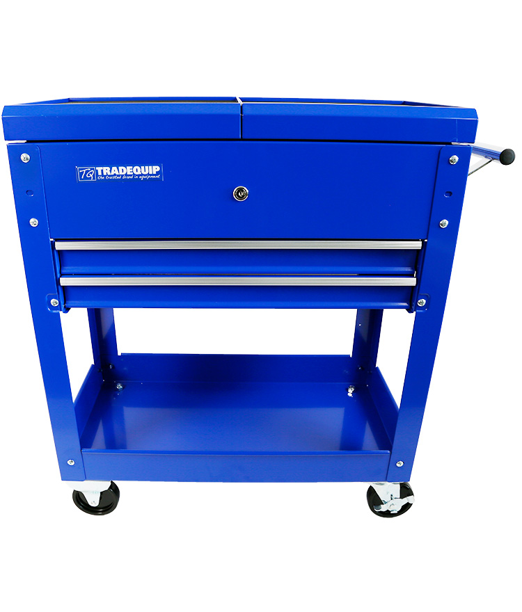 Heavy Duty TradeQuip "Made for the Trade" steel construction makes this lockable two drawer two shelf workshop tool trolley durable enough for moving tools and car parts. Ideal for transporting tools where you need them. Durable steel construction for rugged use. Locking top compartment for security; stores valuable tools for safekeeping with cylinder lock and key. Includes 2 drawers with full-extension ball bearing slides. Features full-length aluminium drawer pulls for easy retrieval. Bottom tray for storage includes lip edges to prevent cargo from falling. Push handle for easy transport. Includes 2 rigid and 2 swivel casters for easy mobility. 700L x 370D x 760H mm. Easily handles loads up to 100kg. Smooth rolling composite rubber castors let you manoeuvre the workshop trolley without marring the floor. Deep drawers and shelves give you plenty of storage for your tools and parts. This is the perfect heavy duty workshop trolley for garages, warehouses and workshops.