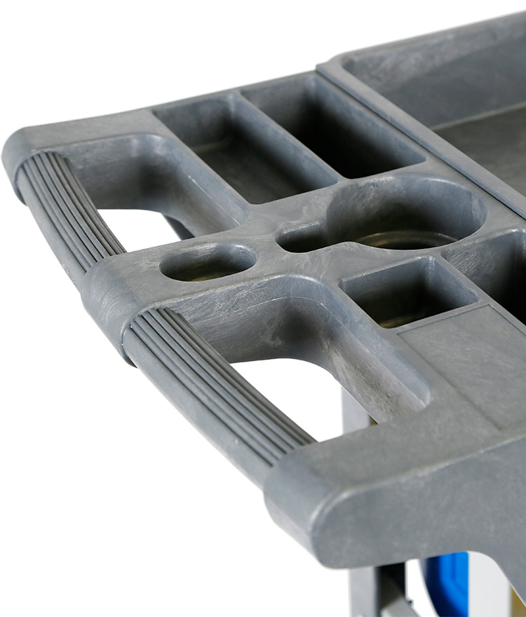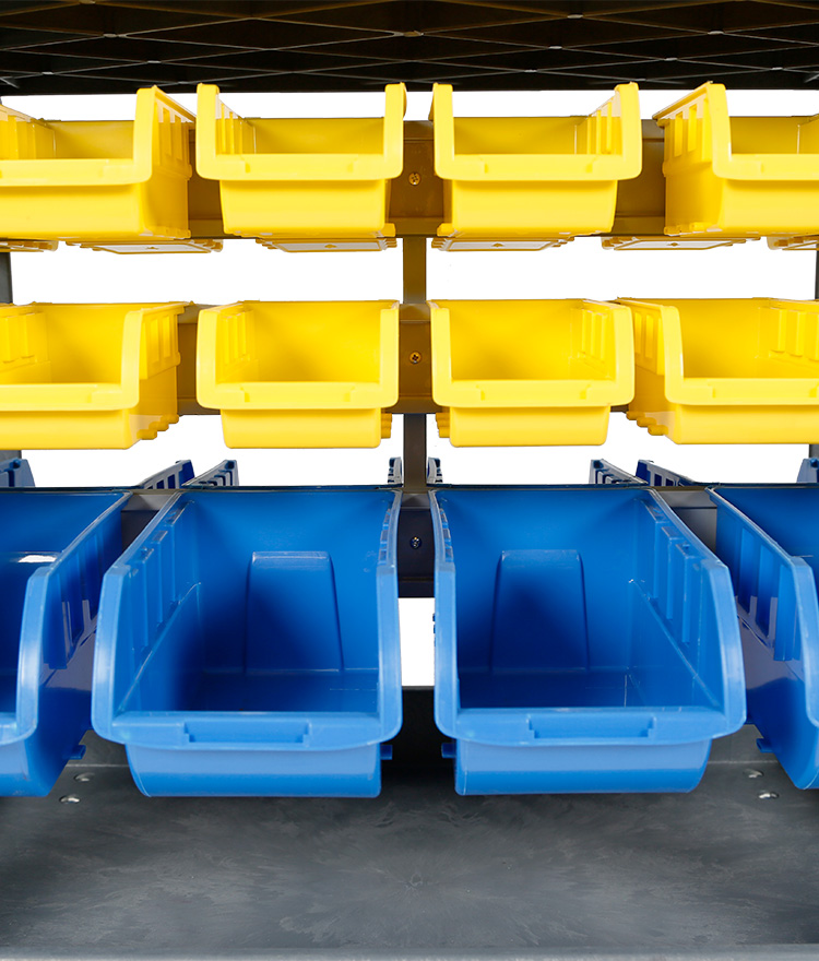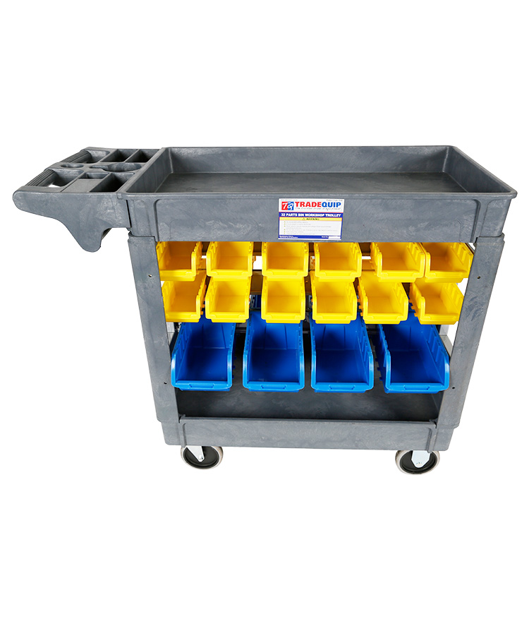 The polymer (heavy duty structural plastic) construction makes this three shelf TradeQuip "Made for the Trade" Workshop Trolley durable enough for moving tools and car parts. Easily handles loads up to 226kg. The rubber castors allow you to manoeuvre the workshop trolley without marring the floor. Deep shelves with 32 parts bins offers plenty of storage for workshop tools and dismantled parts. This is the perfect heavy duty workshop trolley for garages, warehouses and workshops. Heavy-duty structural polymer construction makes this Workshop Tool Trolley & Parts Bin combination tough enough for long, rugged use. Suitable for the loading and movement of heavy-duty parts and tools, this workshop trolley & parts bin storage system combination has the largest load capacity in its category with industrial grade castors that perform perfectly under significant load.