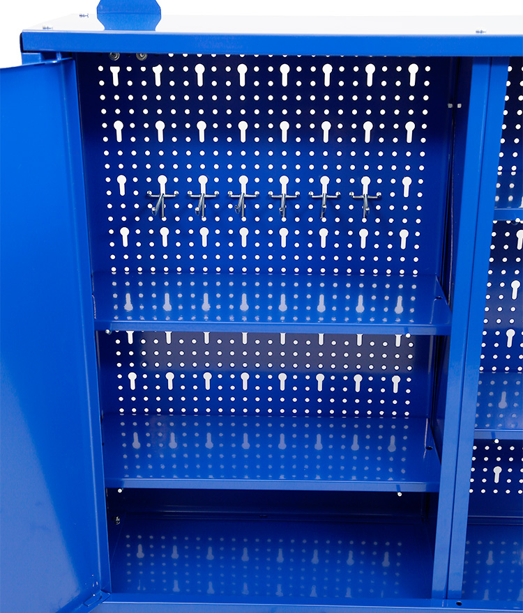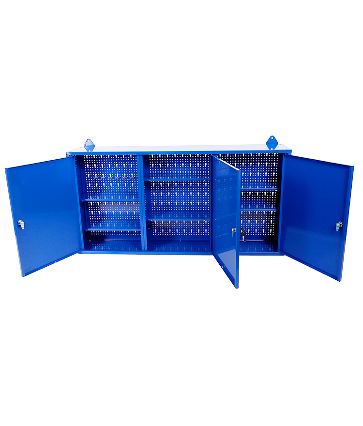 Keep workshop tools and supplies secure with this TradeQuip "Made for the Trade" space-saving Wall Mounted Tool Cabinet with three key lockable doors. Top, bottom and sides are formed into 1mm thick welded steel cabinet. Can be hung on wall or used freestanding. A strong steel constructed wall cabinet with three storage compartments and lockable doors. This tool cabinet/ cupboard is ideal for securely storing tools. (Previous models include product code/s; 1011TR)