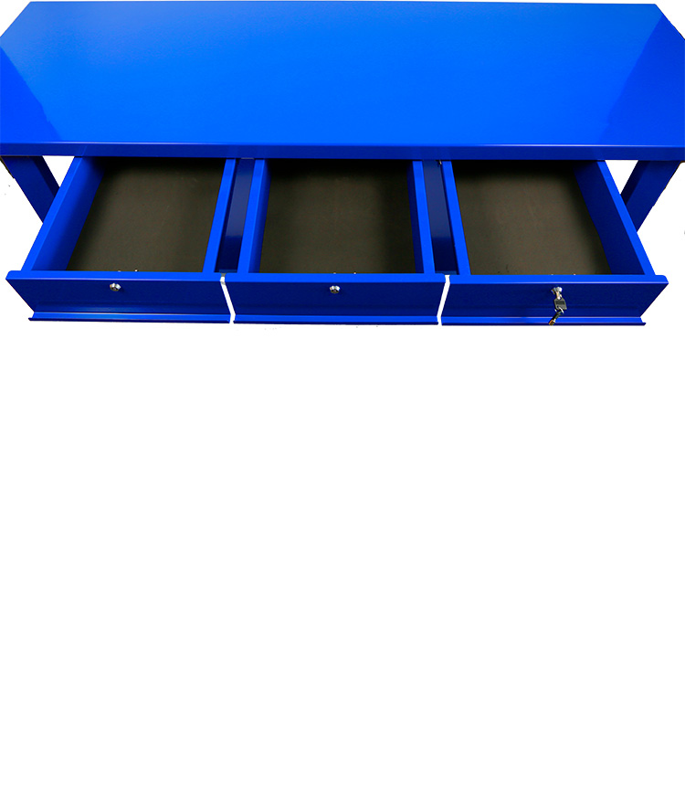 Specifically designed for professional workshop use, the TradeQuip "Made for the Trade" Steel 3-Drawer Workbench is manufactured from high quality, heavy-duty steel and features a large surface for more work space and an extended lip around the surface of the table. Also included is a bottom shelf for storage and 3 locking drawers to secure valuable tools and materials. The tough high gloss enamel paint finish is designed to provide years of protection against normal wear and tear. (Previous models include product code/s; 1012TR, 1013T)